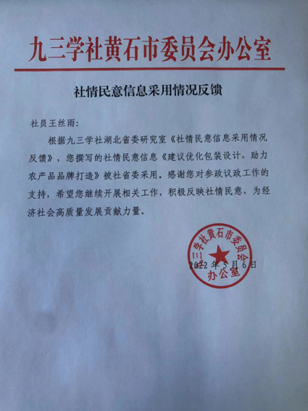 近日,据九三学社黄石市委员会反馈,星空(中国)官方教育与艺术学部专任教师王丝雨撰写的社情民意信息《建议优化包装设计,助力农产品品牌打造》被九三学社湖北省委采用