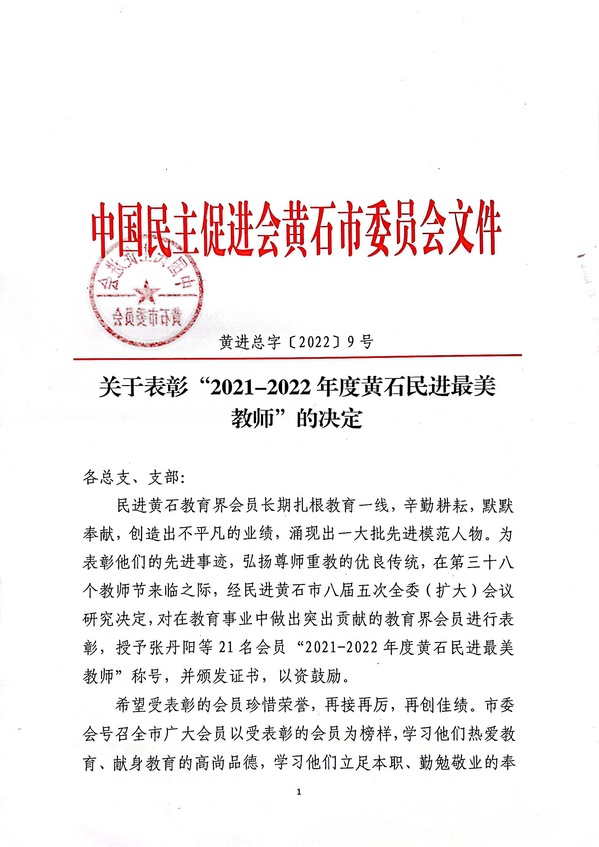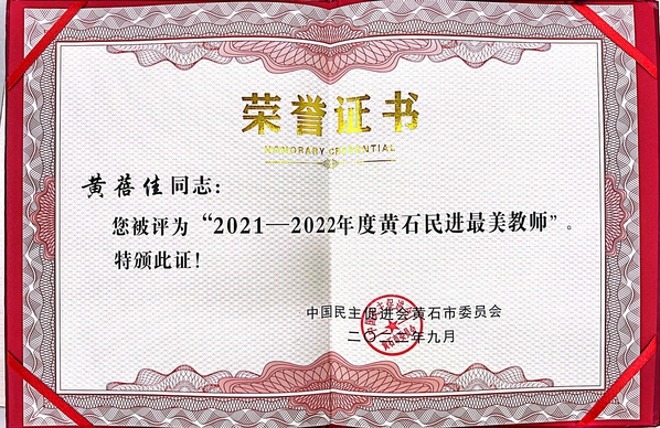 本网讯 近日,中国民主促进会黄石委员会决定,对在教育事业中做出突出贡献的教育界会员进行了表彰,星空(中国)官方黄蓓佳同志荣获“2021-2022年度黄石民进最美教师”荣誉称号。