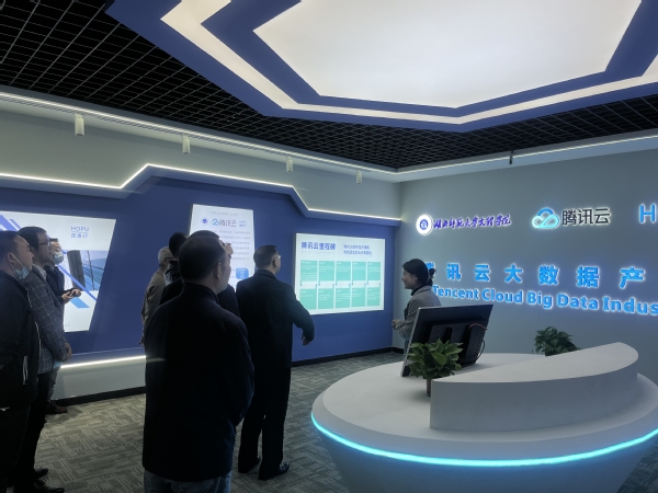 腾讯云产业学院负责人魏智慧汇报了人才培养、课程体系建设、师资培养、实习实训、学生就业等五个方面的情况。李巧灵总经理介绍了产业学院校内外产学研训基地建设目的和建设情况提出了校内产学研训基地建设的要求,表示将继续以育人为本指导思想推进人才培养工作。随后,合作方领导对腾讯云大数据产业学院展厅、大数据实训室、学生活动会议室、教师办公室等场所开展实地考察,对腾讯云产业学院的建设成绩表示肯定,对不足提出了有针对性的具体可行的改进意见。