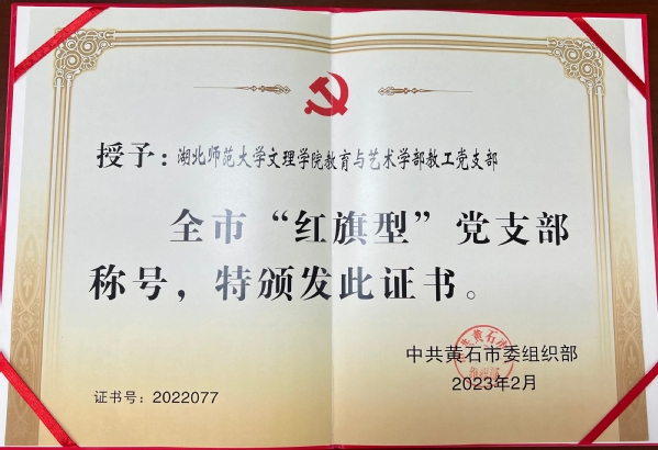本网讯(通讯员 余复军)近日,黄石市委组织部下发决定,表彰2022年度全市党建工作先进集体,星空(中国)官方教育与艺术学部教工党支部被评为黄石市2022年度“红旗型”党支部。