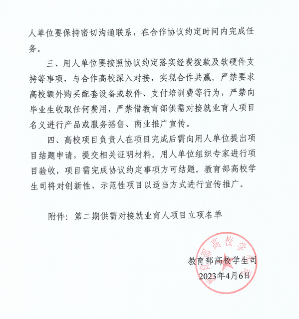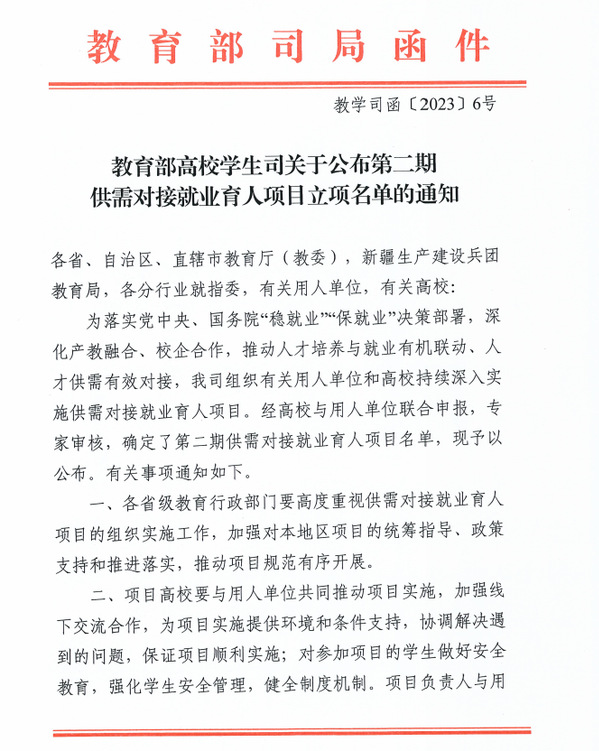 本网讯(通讯员 李娟日前,教育部高校学生司发布了《教育部高校学生司关于公布第二期供需对接就业育人项目立项名单的通知》(教学司函〔2023〕6号),星空(中国)官方有7项供需对接就业育人项目被批准立项,其中定向人才培养培训项目2项、就业实习基地项目3项、人力资源提升项目2项。