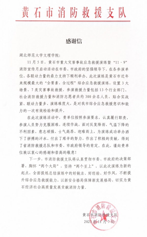 据悉,为参加好这次活动,校领导严格要求,后勤保卫部精心组织,参与人员克服反复降雨、气温急速下降等不利因素,按照有关要求认真参演,得到了省消防救援总队和市委、市政府领导的肯定。