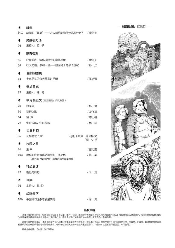 “最佳粉丝杂志”获奖作品《零重力报》是一本由科幻爱好者河流、零始真等自发创办发行的公益网络科幻杂志,以团结民间创作力量为目的,开设有实事热点、焦点人物、专栏、考古、访谈、科幻译园、创刊词译园、科幻小说、科幻资讯、书评、脑洞杂烩和幻迷世界十一个栏目。(《科幻世界》2022年6期刊登了河流的《中国科幻迷杂志发展简史》)