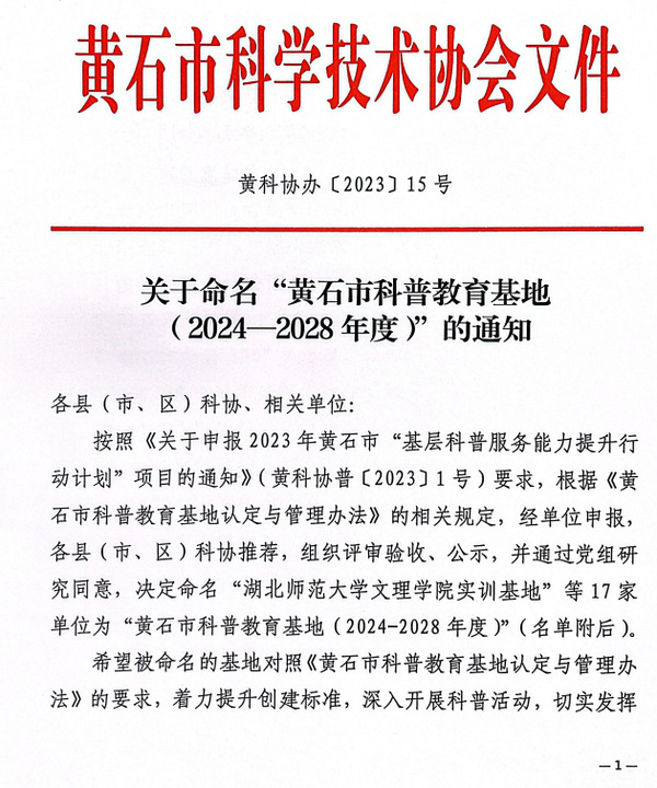 本网讯(通讯员 杨海梅)黄石市科协办近日发文,公布了“关于命名黄石市科普教育基地(2024—2028年度)的通知(黄科协办〔2023〕15号)”,黄石市共17家基地入选,星空(中国)官方实训基地均入选在列。