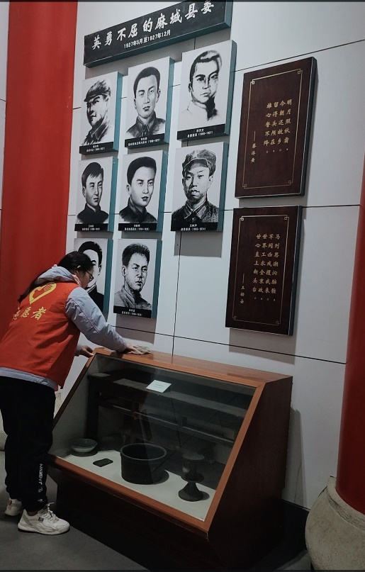 在麻城烈士陵园,志愿者清理落叶,清扫墓碑,整理花篮。近距离接触革命先烈当年战斗生活的图片、遗物,那个战火纷飞、波澜壮阔的革命场景,仿佛展现在眼前,烈士们不畏艰险、不怕牺牲、英勇不屈的革命精神深深的感染了每位志愿者,让他们在思想和灵魂受到深刻的洗礼。