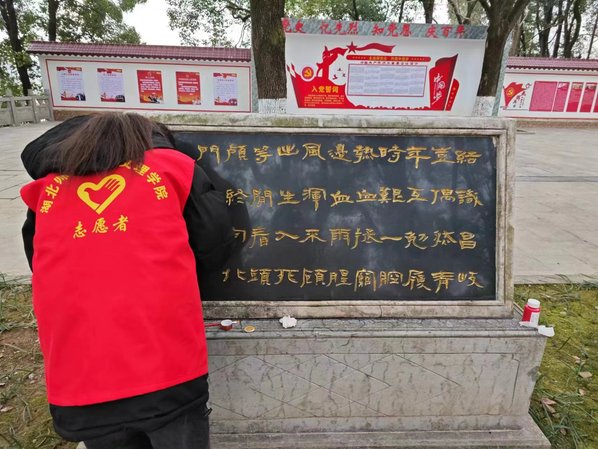 在英山烈士陵园,志愿者们身穿红色马甲,手拿清扫工具,清理了陵园广场前的沙石、落叶、垃圾和夹缝里的杂草。在专业人员的带领下,志愿者开始对墓碑进行描红。志愿者明璇表示,“能让纪念碑闪闪发光的不只是太阳,而是革命烈士英雄的一生,光辉的一生。”描红结束后,志愿者们还参观了英山烈士文物陈列馆。漫步于展厅中,看着墙壁上烈士们的肖像画,听着讲解员诉说的故事,志愿者心潮澎拜:革命先烈为人民解放抛头颅、洒热血,我辈当为民族复兴为已任、当力行。