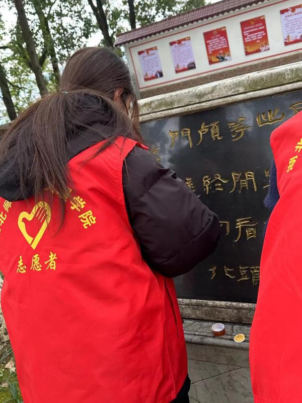 在英山烈士陵园,志愿者们身穿红色马甲,手拿清扫工具,清理了陵园广场前的沙石、落叶、垃圾和夹缝里的杂草。在专业人员的带领下,志愿者开始对墓碑进行描红。志愿者明璇表示,“能让纪念碑闪闪发光的不只是太阳,而是革命烈士英雄的一生,光辉的一生。”描红结束后,志愿者们还参观了英山烈士文物陈列馆。漫步于展厅中,看着墙壁上烈士们的肖像画,听着讲解员诉说的故事,志愿者心潮澎拜:革命先烈为人民解放抛头颅、洒热血,我辈当为民族复兴为已任、当力行。