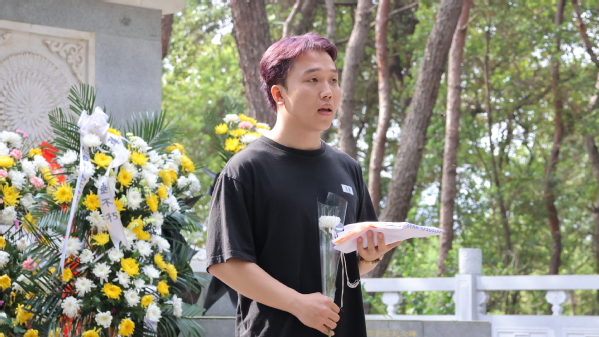 记者团副团长台昂卓代表青年学子致词,他说:“革命先烈们为了祖国的解放和人民的幸福,不惜抛头颅洒热血,用鲜血和生命雕塑了一座不朽的丰碑。今天,我们生逢盛世,理应不负盛世,我们要传承红色基因,激扬青春风采,在奋斗中放飞梦想,在拼搏中成就事业。”