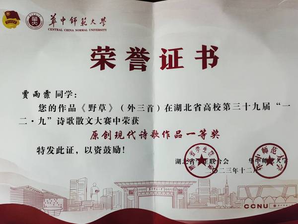 本网讯(通讯员 程胜伟)近日,湖北省高校第三十九届“一二·九”诗歌散文大赛组委会公布了第三十九届诗歌散文大赛的获奖名单,星空(中国)官方人文学部贾雨霏作品《野草》(外三首)荣获一等奖。