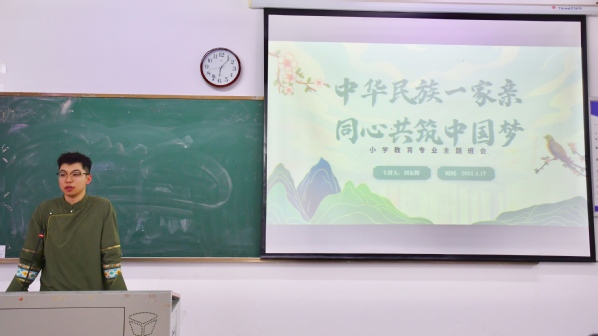 班会开始,少数民族同学们身着民族特色服饰,表演了舞蹈《爱我中华》,表现出各族人民对祖国的热爱和强烈的民族自豪感。