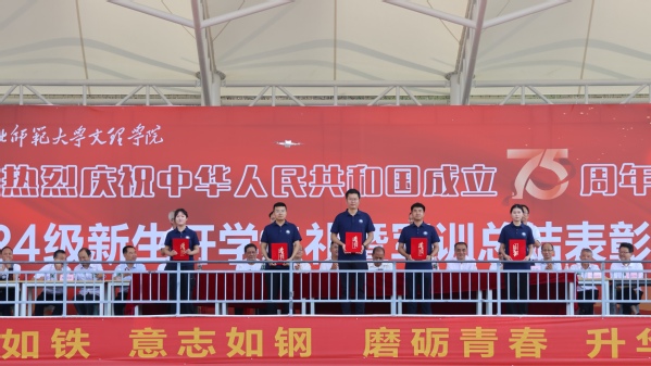 常务副校长杨学斌向承训单位授锦旗,党委书记杨邓红宣读了2024级新生军训表彰文件,校领导为本次军训过程中产生的优秀个人、团体及优秀辅导员颁奖。