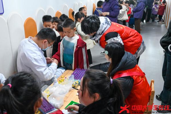 活动中,志愿者与医护人员紧密配合,全程协助幼儿体检。在身高体重测量、视力检查等环节,他们细心引导孩子排队,用“小勇士勋章”鼓励采血幼儿,缓解紧张情绪。一位小朋友在完成检查后骄傲地说:“我不怕,因为哥哥姐姐一直陪着我!”