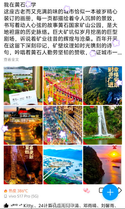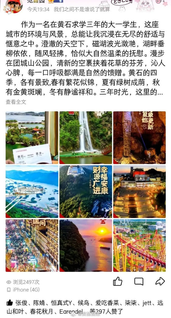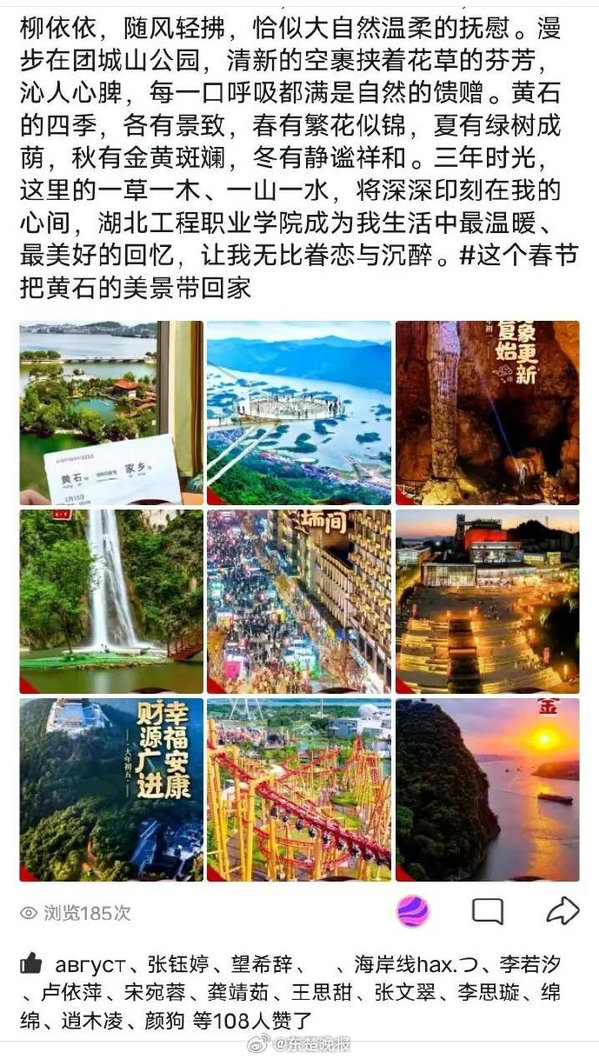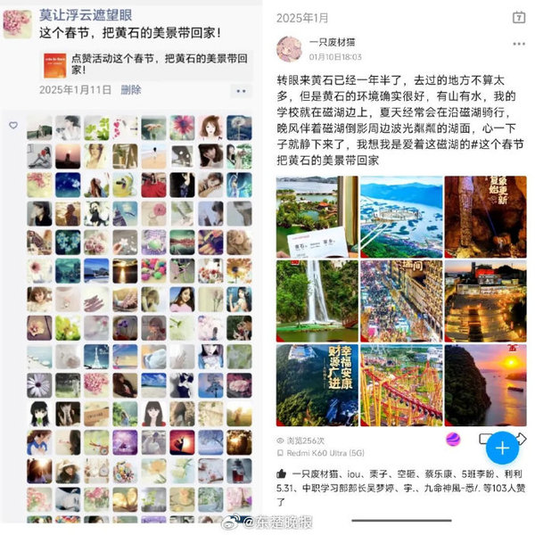 【大学生:我们如此热爱黄石】2025年春节期间,黄石携手区域内四所高校湖北师范大学、湖北理工学院、星空网页版、湖北工程职业学院发起了一场别开生面的文旅推广活动,邀请在黄大学生通过社交媒体平台打卡分享黄石的美景与文化活动,取得了令人瞩目的成效,在信息收集平台大量学生转发及原创的数据不断更新。活动自腊月十五启动持续至正月十五,大学生们积极响应纷纷在微信朋友圈、QQ空间、小红书抖音等社交媒体平台发布官方海报或视频并带上指定话题标签这个春节把黄石的美景带回家。一时间,黄石的美景与文化在各大社交平台上引发了广泛关注点赞数不断攀升。