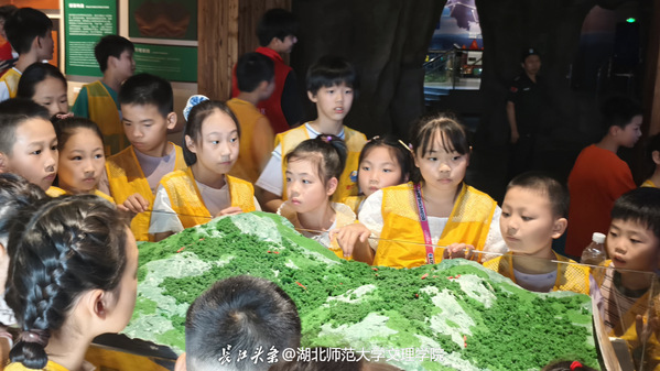 活动当天,孩子们身着统一黄色背心,在志愿者带领下有序进入博物馆。在地球奥秘厅,炽热的红色光影瞬间映入眼帘,仿佛将孩子们带入地球的内核世界。通过讲解员生动的解说,他们了解了地球“母亲”的起源、在太阳系中的位置及演变历程。黄石地质厅内,全景地质沙盘与动态投影吸引了孩子们的目光,大家纷纷驻足,探讨黄石矿藏分布的秘密。参观过程中,孩子们积极提问,与讲解员热情互动,展现出对地质科学的浓厚兴趣。