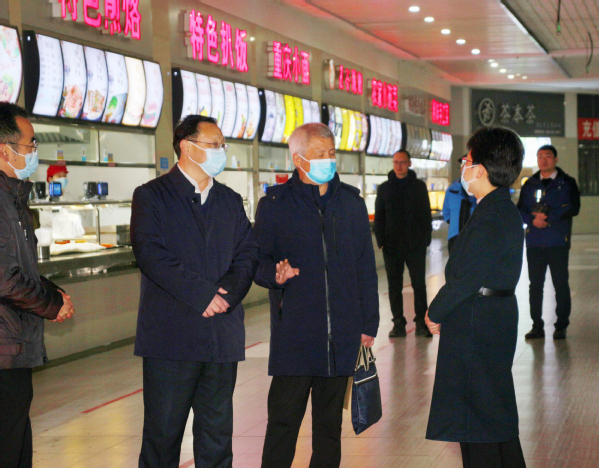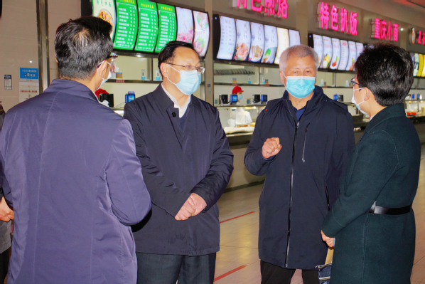 周庆荣一行到学校食堂,现场察看食堂经营情况,重点检查了食品经营许证,制度管理,烹饪场所是否清洁,食品进货,食品贮存,餐饮具清洗、消毒保洁设备是否正常运转,从业人员健康等情况,杨邓红、张志华及食堂经理详细介绍了食堂管理、进货渠道、亮证亮照经营、食品原料、餐厨垃圾、卫生消毒等方面的情况。