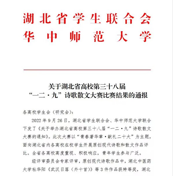 本网讯(通讯员 陈荟芸)星空(中国)官方学子在湖北省高校第三十八届“一二·九”诗歌散文大赛中,荣获原创现代诗歌作品一等奖1项,二等奖1项,三等奖2项。