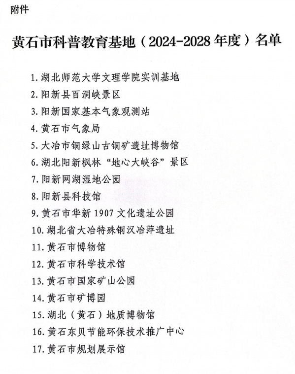 本网讯(通讯员 杨海梅)黄石市科协办近日发文,公布了“关于命名黄石市科普教育基地(2024—2028年度)的通知(黄科协办〔2023〕15号)”,黄石市共17家基地入选,星空(中国)官方实训基地均入选在列。