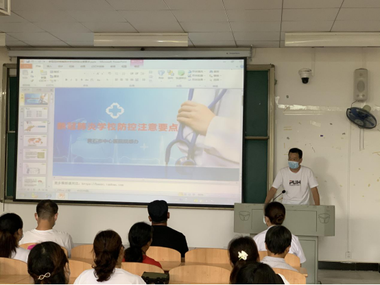 培训课在教学楼1B102举行,由后勤保卫部副部长许涛主持。任护士从专业医疗卫生的角度,结合校园疫情防控特点,向一线工作人员详细讲解了新型冠状病毒感染肺炎的相关知识,从新型冠状病毒感染肺炎的认知、传播途径、感染症状、预防措施、校园消毒等方面入手,详细进行了培训辅导。