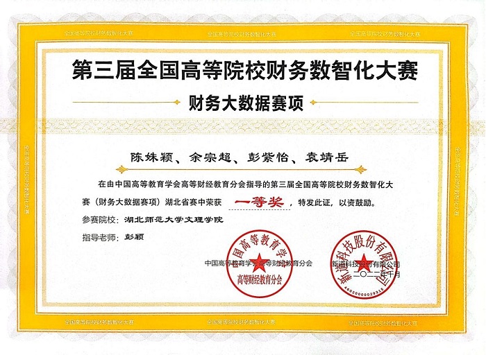 10月8日,2022年湖北省第三届全国高等院校财务数智化大赛圆满落幕,星空(中国)官方经济与管理学部财务管理专业由陈姝颖,余宗超,彭紫怡,袁靖岳同学组成的团队获得一等奖,指导教师为彭颖。由邵雅琦,周梦婷,黄羽轩,董婷同学组成的团队在袁家健老师的指导下获得三等奖。