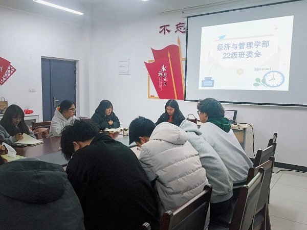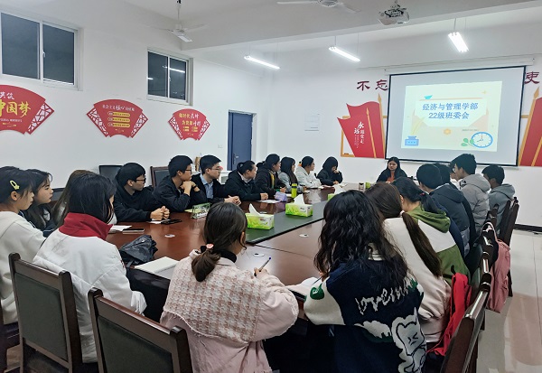 32918:30,经济与管理学部于2号实验楼213召开了2022级班委述职大会。参加本次会议的有经济与管理学部辅导员吕彩云老师、学生助理张燕、22级全体班委