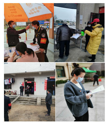 图1是理工学部党支部书记肖圣芳老师,抗疫期间他在防控点值班,对进出人员进行体温检测;对社区居民进行防控宣传;对社区9户42人进行责任包保。图2是理工学部辅导员董诗琪老师,她主要是负责协助小区物业进行出入小区人员登记,消毒,测量体温等工作。图3是理工学部辅导员徐露老师,平时主要是排查村内人员及外来人员个人信息和武汉接触史;挨家挨户测量体温并上报;巡查村内是否有人无故外出并劝返;宣传村镇防控政策。图4是理工学部教学秘书余璟昭老师,她负责包保入户小区15户住户,共计51人;到疫情结束前,每天电话或上门询问、问候包保户的身体状况;及时掌握51名包保户的健康状况,如有情况负责联系社区及时送诊;帮助护送包保户订购的生活物资或其它爱心菜等物资;帮助解决包保户中孤独老人、残疾人或不会使用手机订购果蔬菜品的家庭代购生活物资,以及帮助解决维修等急难问题;帮助疏导包保户的情绪、化解矛盾等。