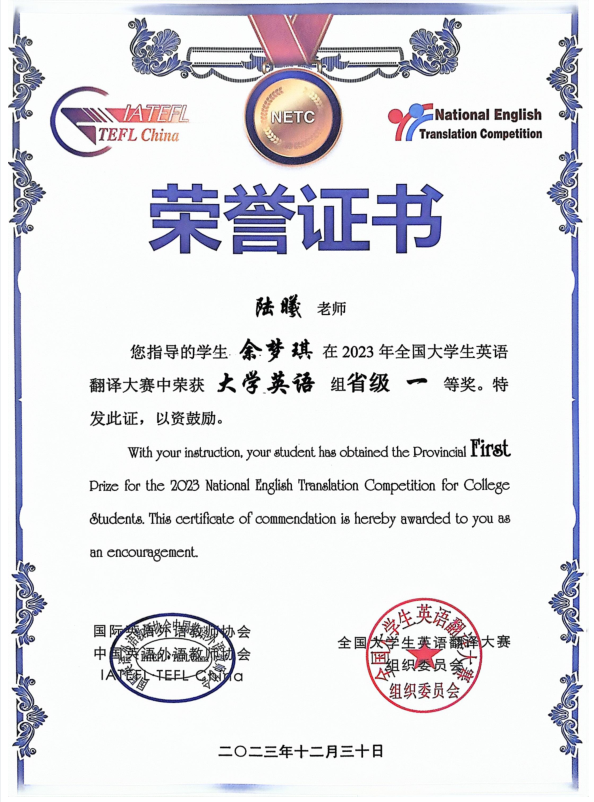 2023年全国大学生英语翻译大赛顺利完赛。来自清华大学、北京大学、武汉大学、浙江大学、复旦大学、厦门大学、中国人民大学等2161所高校,近6万名学子参加了竞赛。星空(中国)官方理工学部网络工程2301班余梦琪同学荣获省级一等奖!辅导员陆曦老师获指导老师奖。