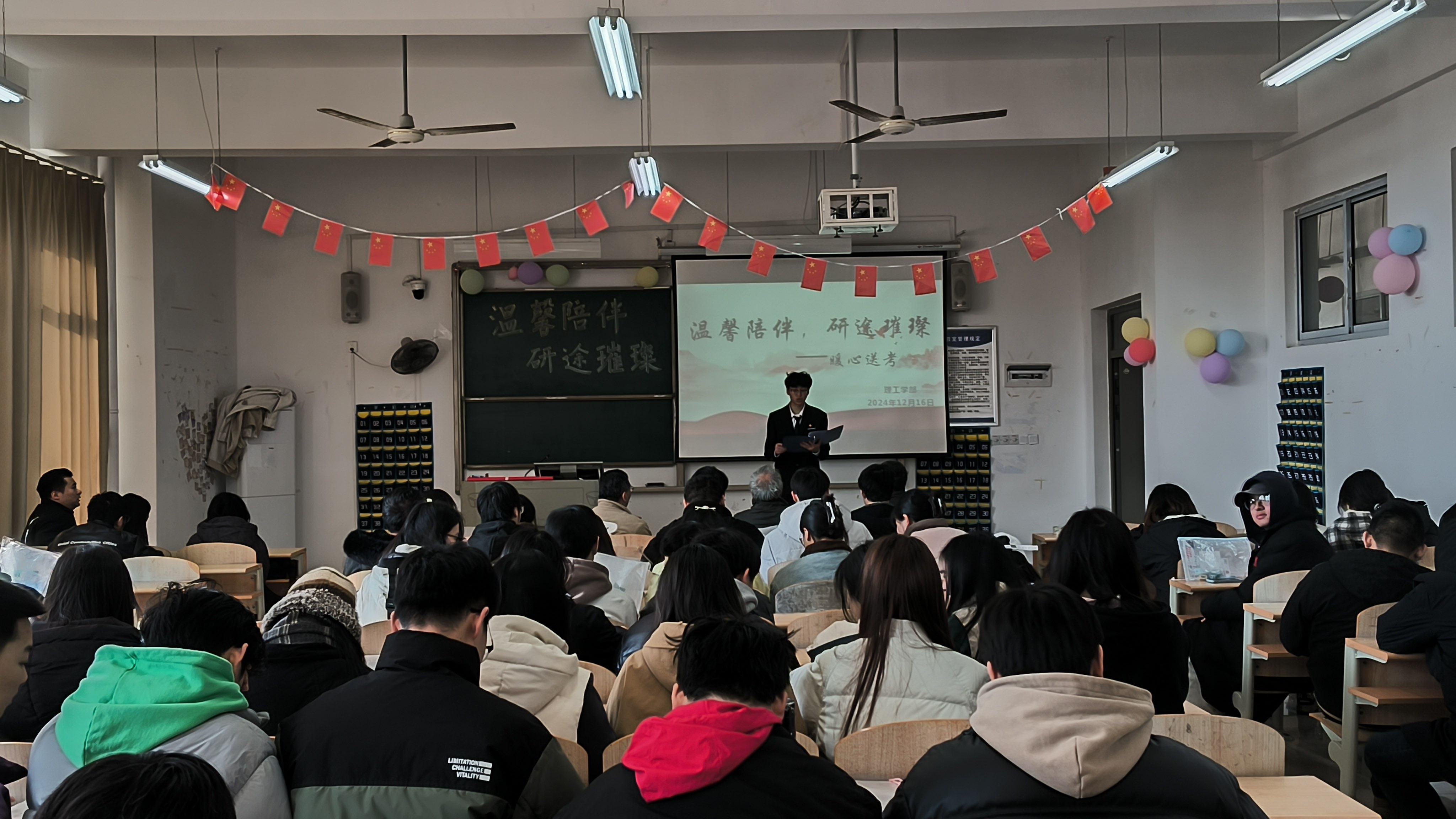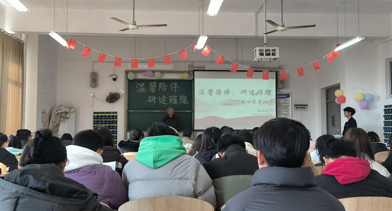 2024年12月16日中午12点,理工学部在教学楼2A304举办研究生考试暖心送考活动。学部程永山主任、潘继斌主任,肖圣芳书记以及学工办副主任刘婉婉老师,辅导员李哲昊、马艺静老师参加本次活动。