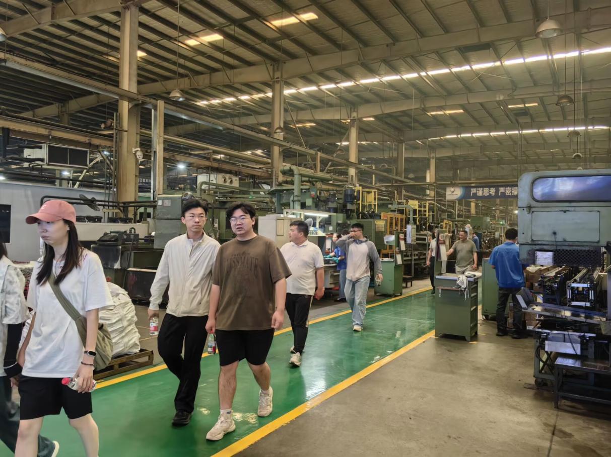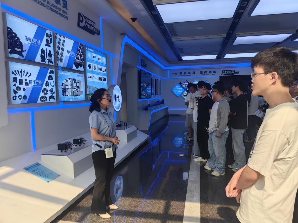 在黄石东贝电器股份有限公司智能制造基地,学生们实地观摩了全球领先的变频压缩机数字化生产线,讲解员系统讲解了永磁同步电机控制技术、智能检测系统等专业知识的工业应用场景,并观看了公司发展历程、目前成就及后续发展规划的视频。在东贝制冷有限公司,师生不仅探访了新一代环保冷媒应用实验室,更深入冰淇淋机智能化生产车间,让学生了解课程中“智能制造与节能优化”的理论关联。