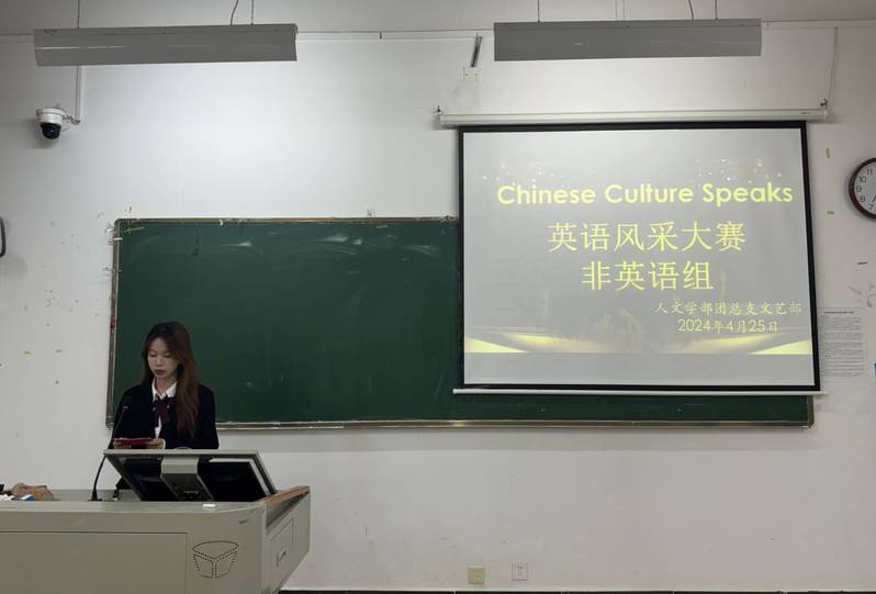 英语作桥梁,文化传世界。为丰富校园文化生活,创设良好的英语活动氛围,提升同学们对英语学习的兴趣,给学生提供展示个性、发挥特长、展现英语风采的平台,人文学部于4月25日晚在教学楼 1A201、1A203举办以“Chinese Culture Speaks”为主题的英语风采大赛。此次活动旨在激发大学生对祖国、对中华传统文化的热爱之情,提升学生的文化自信,传递中国文化正能量。