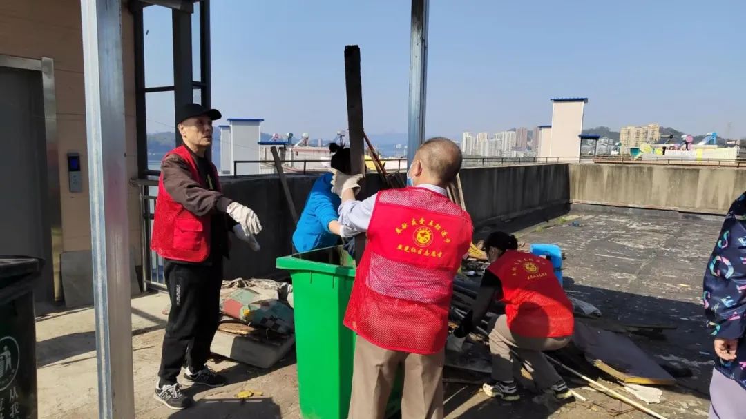 理工学部志愿者们身着整齐的服装,迅速地投入到清理工作中。他们搬运沉重的杂物,清理角落的垃圾,每一个动作都透露出坚毅和力量。并在社区志愿者的引导下高效清理,穿梭在楼顶的各个角落,不放过任何一个卫生死角。理工学部的志愿者们,脸上洋溢着青年的活力,他们用双手传递爱心,用行动践行责任,为社区的清洁贡献着自己的力量。