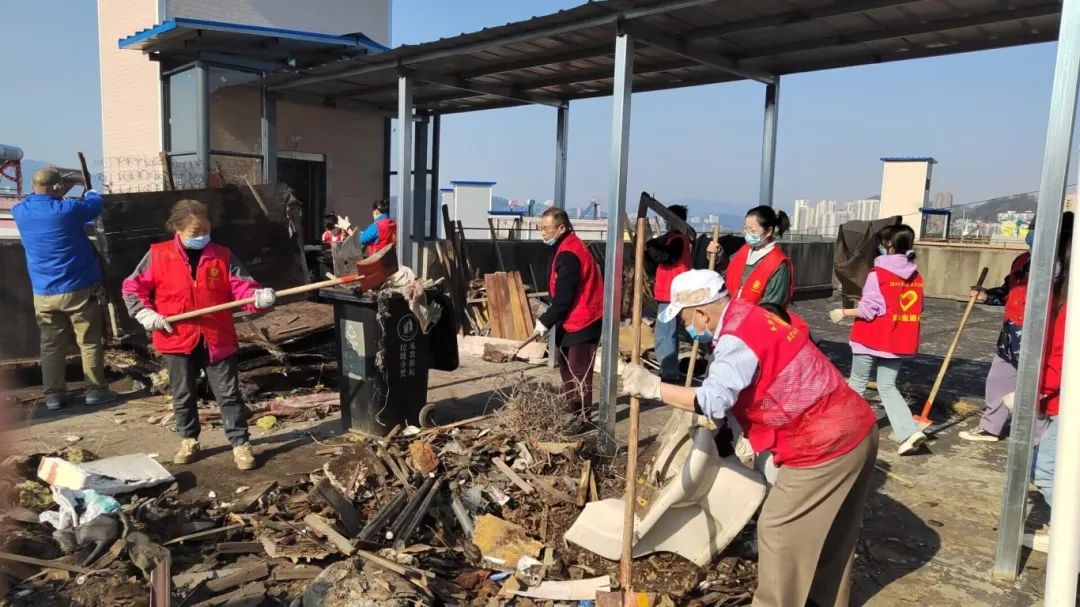 理工学部志愿者们挥汗如雨数小时,让废弃家具、建筑废料等楼顶"顽疾"彻底消失。分类码放的再生资源、光洁如新的水泥地面。"携手志愿,清洁社区"这八个字不仅是行动纲领,更是每位居民共建家园的宣言。当扫帚与铁锹碰撞出和谐的节奏,当汗水顺着笑颜滴落成奉献的诗行,我们正用实际行动诠释:美好社区不是等来的风景,而是用双手编织的幸福图腾。让我们继续携手,让文明之花绽放在每寸土地,让互助的温度流淌进每扇窗棂!