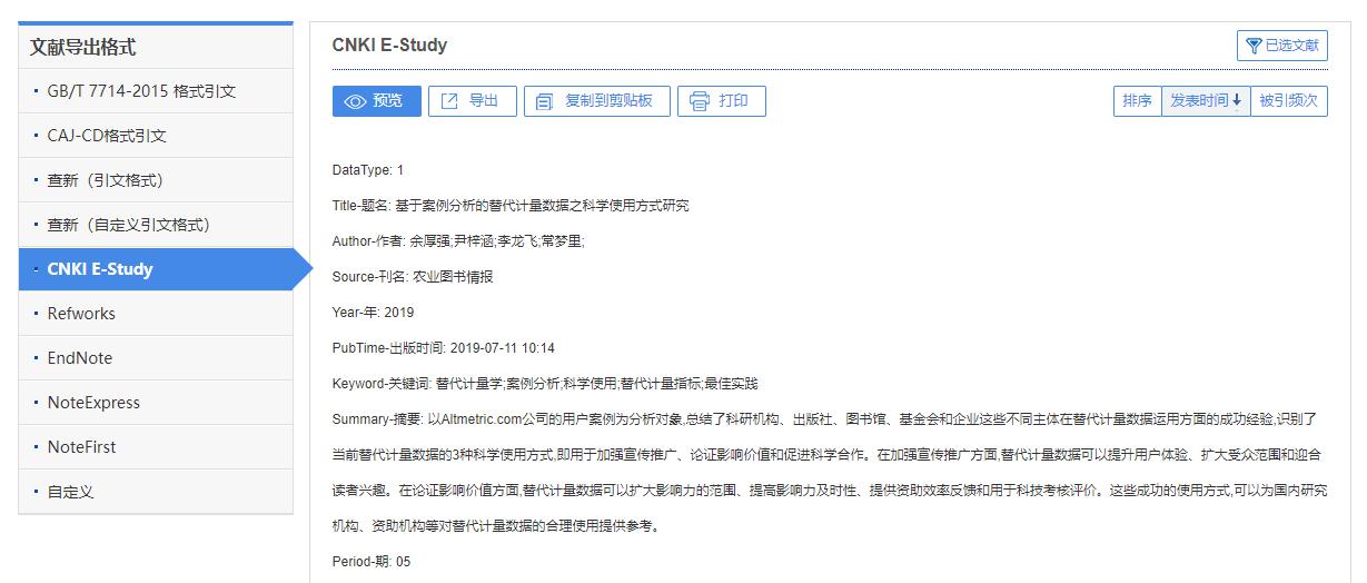 收藏夹页面显示已收藏文献的类型、题名、作者、机构、来源等信息,支持按收藏时间筛选或排序。点击文献标题,跳转至该文献知网节页面。