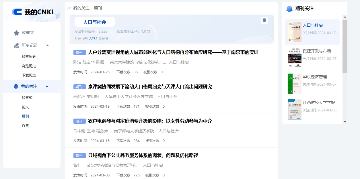 登录个人账号后,可在期刊详情页面点击按钮关注期刊。进入我的CNKI-我的关注-期刊,可查看已关注的期刊所发表的文献,管理已关注期刊。