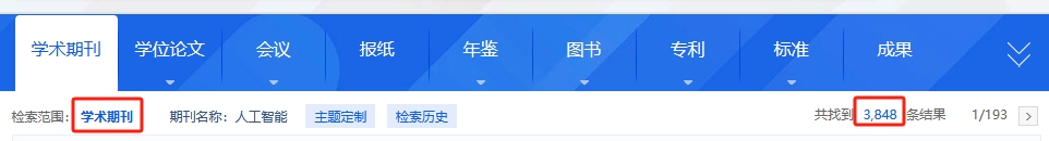 总库检索后,点击各资源类型名称,下方的检索结果区即为该资源类型文献。
