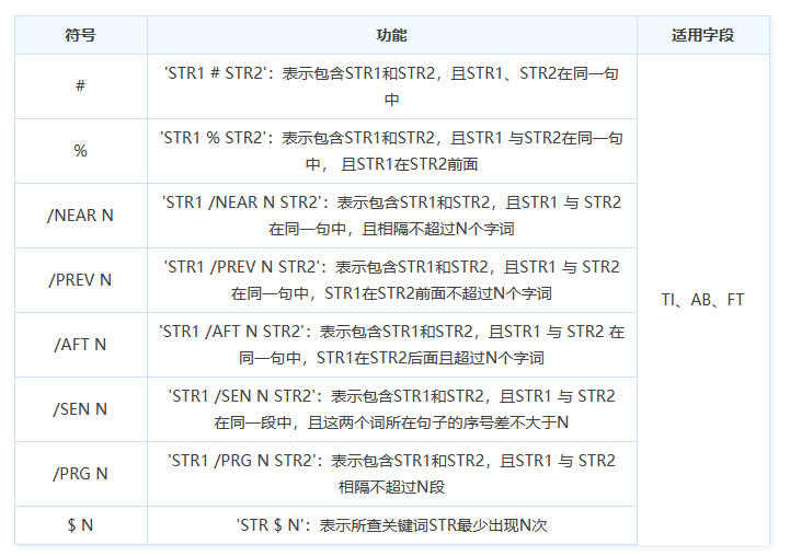 专业检索是借助SQL语句表达检索需求,在使用专业检索时需要有明确的检索字段,通过<字段代码><匹配运算符><检索值>构造检索式。以 KY='知识服务' AND (AU % '陈'+'王')为例,KY、AU可替换为自己检索的字段,=或%可根据自己的需求使用对应的匹配运算符,KY和AU检索字段间用AND、OR、NOT连接,字段内多个值的关系用+、-、*来组合,或者位置限定的语法符号。