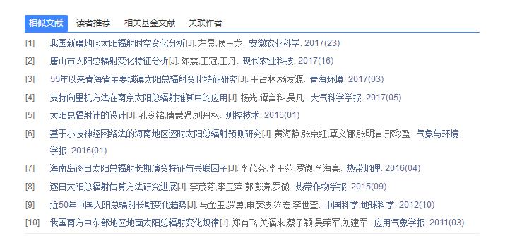 如图5.8.5.3所示,左侧默认展示近十年的栏目信息,还可以切换标签查看近五年、近三年、近一年的栏目信息。右侧为该栏目下的文献列表。