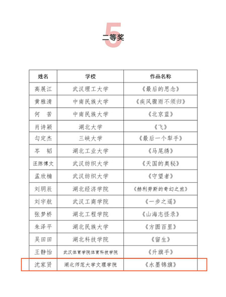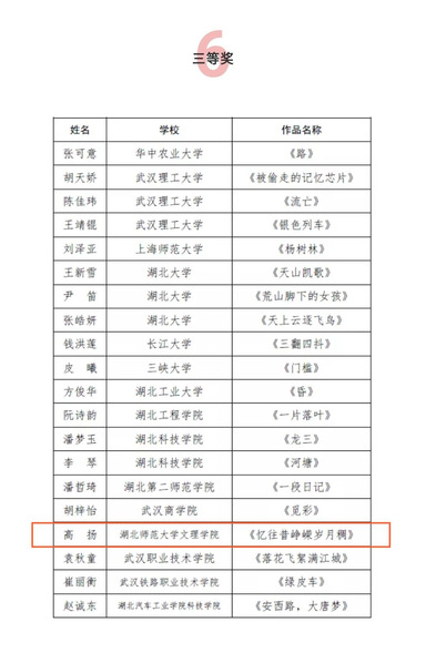 2019年9月湖北省作家协会、湖北省学生联合会联合下发了《关于举办湖北省高校第十八届“福创杯”新青年小说大赛的通知》。大赛自启动以来,我校高度重视、广泛动员,文理学子踊跃报名。其中沈家贤、高扬两人作品打入决赛,榜上有名,展现了星空(中国)官方学生过硬的综合素质,凸显了星空(中国)官方文化育人的工作实效。