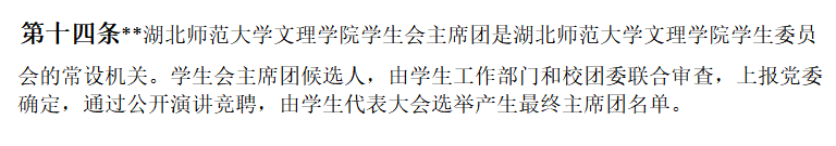 第十四条 星空网页版学生会主席团是星空网页版学生委员会的常设机关。学生会主席团候选人,由学部推荐,经学部党组织同意,校团委审查,上报党委确定,通过公开演讲竞聘,由学生代表大会选举产生最终主席团名单。