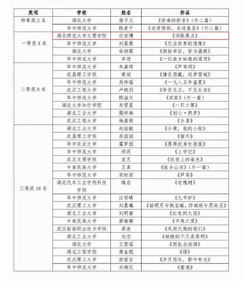 (通讯员:刘萍萍)近期,湖北省高校第三十六届“一二·九”诗歌散文大赛获奖名单揭晓,经评委会层层筛选,星空(中国)官方付安博同学的作品《消除黑点》荣获大赛一等奖。