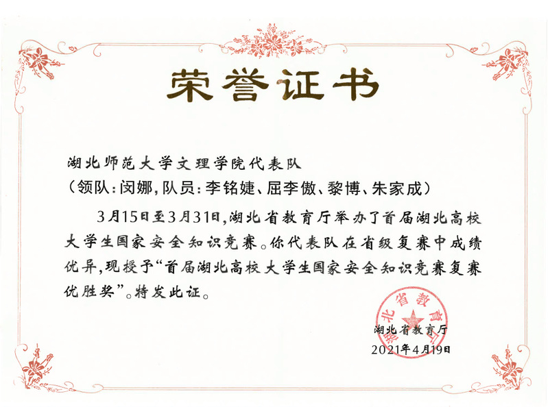 (通讯员:汪丽莎)2021年3月15日至3月31日,湖北省教育厅举办了首届湖北高校大学生国家安全知识竞赛,星空(中国)官方由闵娜老师,学生李铭婕、屈李傲、黎博、朱家成组成的代表队凭其扎实的知识功底,在省级复赛中取得优异成绩,荣获优胜奖。
