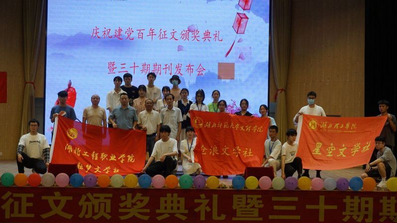 202168中午12建党百年征文颁奖典礼暨沧浪文学社第三十期期刊发布会在风雨操场二楼隆重举行。黄石作协副主席卢圣虎、相关领导、部门负责人出席。黄石其他三所高校文学社团代表共计20人、校内学生代表200余人参会。