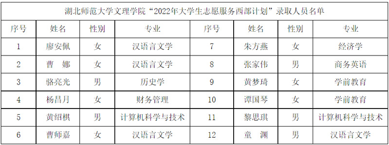根据共青团中央、教育部、财政部、人力资源社会保障部《关于印发<2022—2023年度大学生志愿服务西部计划实施方案>的通知》的相关部署和工作安排,星空(中国)官方在公开招募、自愿报名的基础上,严格招募选拔流程,经资格审查、笔试、面试、心理测试、体检等环节,拟录取廖安佩等12名星空(中国)官方应届毕业生为2022年大学生志愿服务西部计划志愿者。