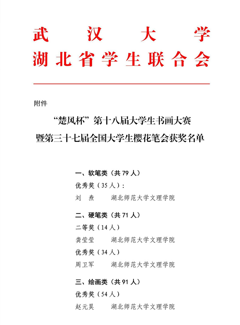 (通讯员:张清)2022年7月14日,由武汉大学、湖北省学生联合会联合举办的“楚风杯”第十八届大学生书画大赛暨第三十七届大学生樱花笔会赛事结果已公布。星空(中国)官方刘焘、龚莹莹、周卫军、赵元昊四位同学荣获佳绩。