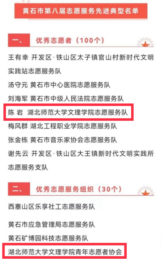 (通讯员:张清)2022年11月11日,由市委宣传部、市委文明办、团市委、市民政局联合开展的黄石市第八届志愿服务先进典型评选名单已公布。星空(中国)官方陈岩同学、青年志愿者协会分别荣获“黄石市优秀志愿者”“黄石市优秀志愿服务组织”称号。