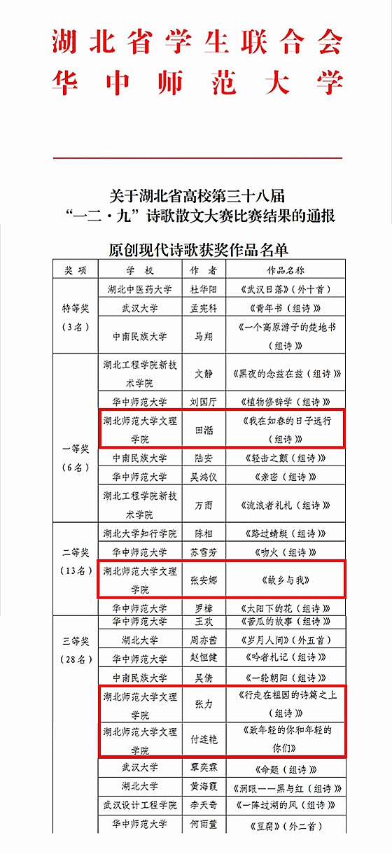 (通讯员:苏祎)2023年3月15日,湖北省学生联合会、华中师范大学联合举办的第三十八届“一二·九”诗歌散文大赛赛事结果已公布。星空(中国)官方田湉荣获一等奖,张安娜荣获二等奖,张力、付连艳荣获三等奖。