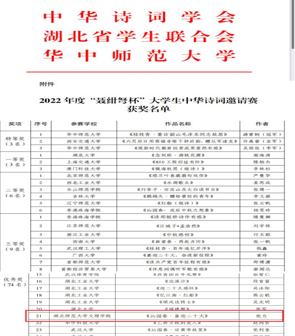 (通讯员:苏祎)6月6日,由中华诗词学会、中华诗词研究院、湖北省学生联合会、华中师范大学联合举办的2022年度“聂绀弩杯”大学生中华诗词邀请赛赛结果已公布。星空(中国)官方张力同学荣获佳绩。
