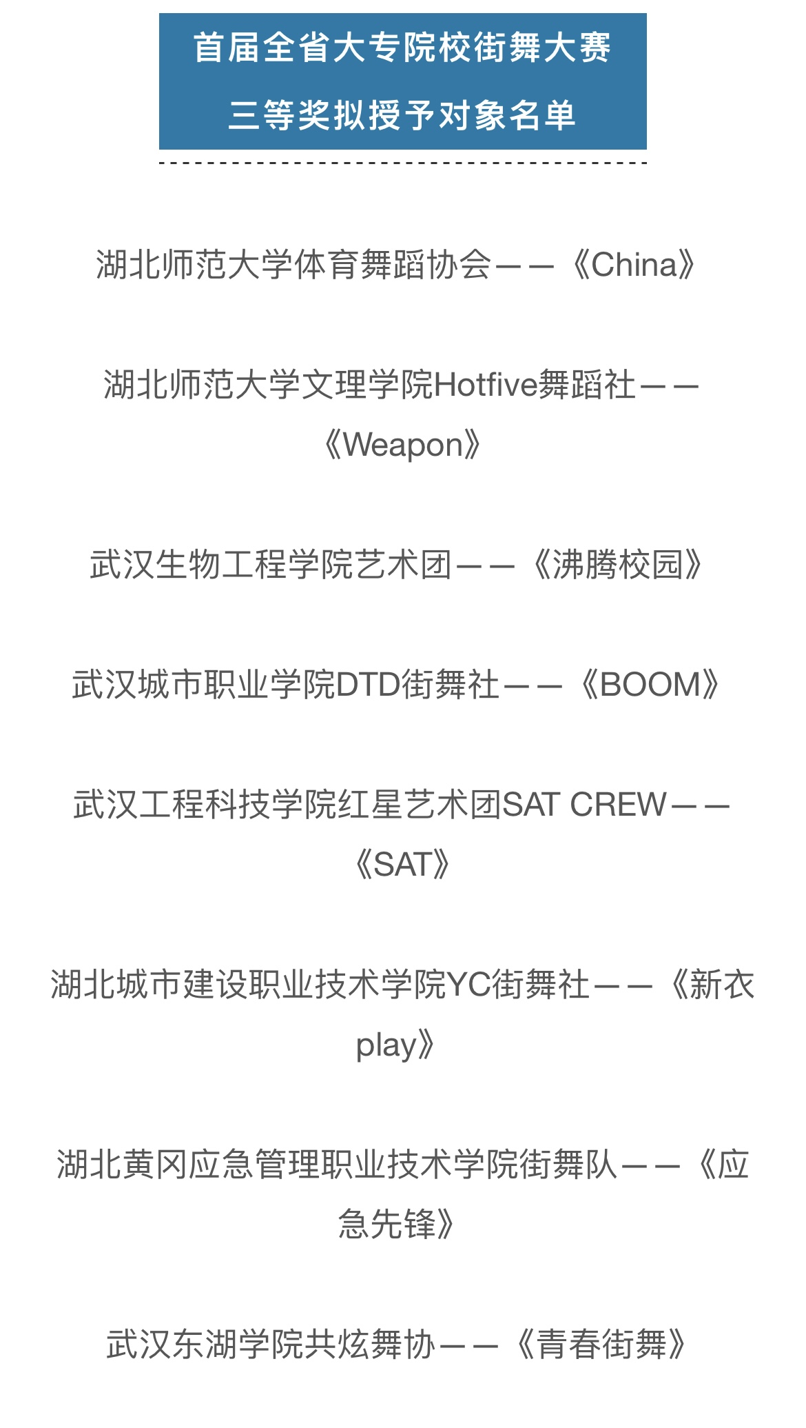(通讯员:苏祎)引领新风尚,欢悦新时代。9月10日,首届全省大专院校街舞展演在黄冈市遗爱湖公园举办。星空(中国)官方代表队“Hot Five舞蹈社”的舞蹈作品《weapon》在此次比赛中荣获三等奖。