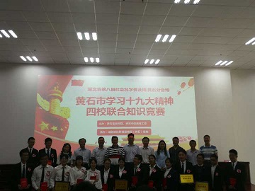 5月24日下午,由黄石市社科联和黄石市高校工委主办、湖北省社科普及教育(黄石)基地承办的黄石市“学习十九大精神”四校联合知识竞赛在湖北师范大学文都大讲堂举行。湖北师范大学副校长、黄石市社科联主席雷儒金出席活动并讲话,市委高校工委副书记、市教育局副局长徐可,市社科联专职副主席徐凌,以及在黄四所高校及相关部门负责人、学生代表参加活动。