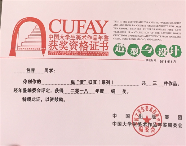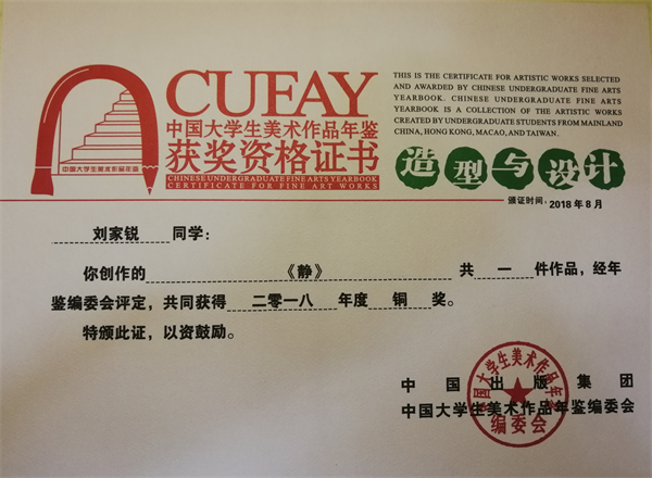 近日,星空(中国)官方从中国大学生美术作品年鉴编委会获悉,星空(中国)官方艺术学部多名学生美术作品入选,其中刘家锐等三名学生获铜奖,刘安宁等两名学生获优秀奖。