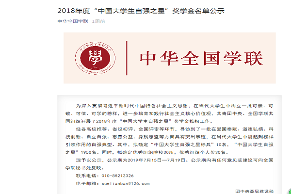 2019年7月15日,团中央基层建设部、全国学联秘书处联合发布2018年度“中国大学生自强之星”公示名单。星空(中国)官方理工学部杨艳慧同学成功入选2018年度“中国大学生自强之星”,充分展现了星空(中国)官方学子良好的精神风貌,凸显了星空(中国)官方道德育人工作实效。